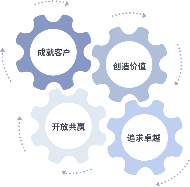成就客户是一切决策的出发点,,创造价值是衡量所有工作的标准,,,追求卓越是我们做事做人的态度,,,开放共赢是我们的格局也是最终的结果。。价值观的齿轮环环相扣,,,,推动着组织里的每个人不断向前。。。。