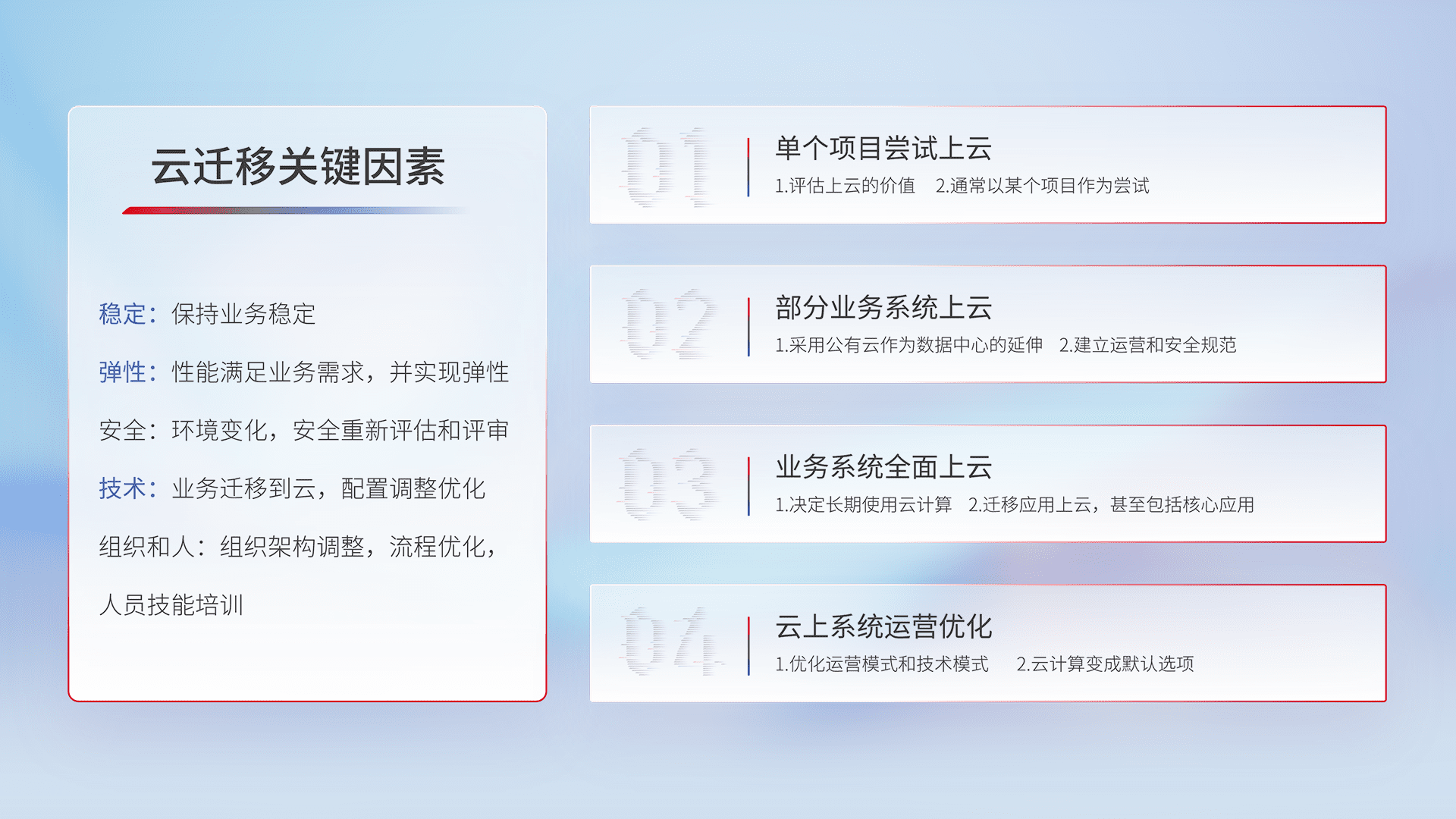 结合实际业务,,从规划设计、、、云平台选型、、、、云原生改造、、、、数据迁移、、、集成交付,,迁移全过程为客户识别最佳上云路径,,做好风险识别管理,,,,设计网络架构、、、、身份权限、、、、安全审计合规、、、操作审计、、日志审计、、、、监控告警策略、、多站点容灾设计等,,对云上基础设施进行整体规划,,,提升IT治理水平,,,,以满足弹性、、、、高可用、、、、高性能的需求。。。。