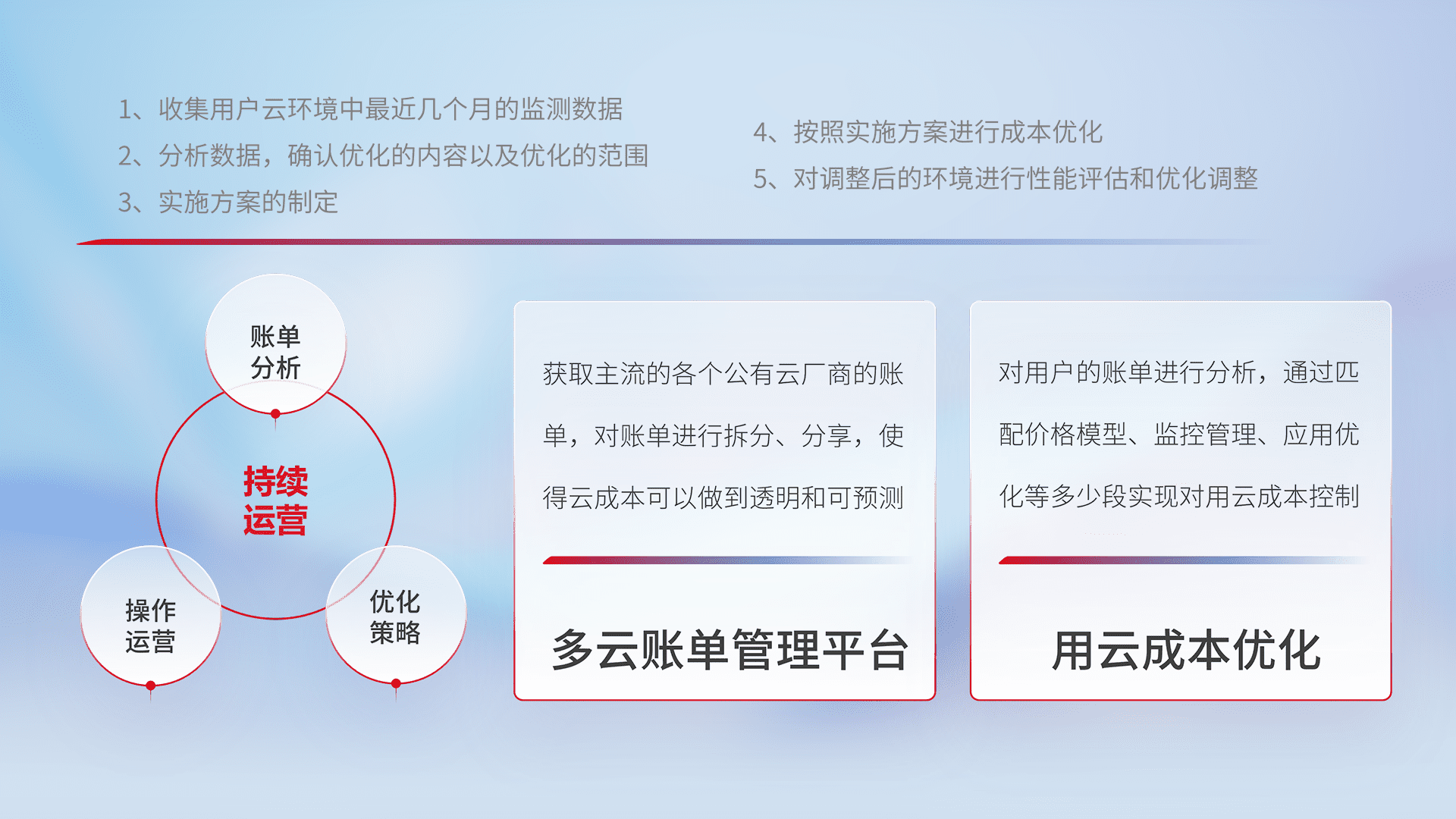 通过多云纳管,,,以统一的资源数据模型把客户的云资源进行抽象和封装,,进而实现对多云资源的统一操作,,保障云资源管理的可靠性、、、稳定性与可用性。。。量身定制化运维内容,,,,配置、、、、开发运维、、、补丁管理、、、备份、、监控、、、、认证和访问管理、、、审计和日常巡检等,,保障在用云过程中的可靠度,,稳定度以及高可用率。。